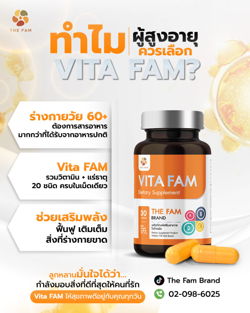 ผู้สูงอายุจำนวนมาก “รู้สึกไม่แข็งแรงเพราะขาดสารอาหาร” มากกว่าป่วยจริง การเติมสารอาหารที่เหมาะสมจึงเป็นสิ่งสำคัญมาก และ Vita FAM ก็คือหนึ่งในตัวช่วยที่ทำให้ผู้สูงอายุได้รับสารอาหารครบขึ้น ใช้ชีวิตได้กระฉับกระเฉง และมีคุณภาพชีวิตที่ดีขึ้นแบบไม่ยุ่งยาก